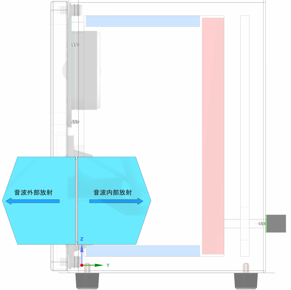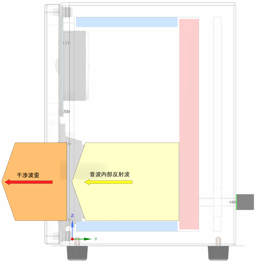 音波外部放射(➜)と同時にボックス内部に同量の音波内部放射(➜)が放射されます。内部放射された音波はスピーカーボックス背面に衝突します。 背面には音波消音材(■)が取付られ、音波を消音しようとしますが、特に低音帯域の音波を消音しきれず音波内部反射波(➜)としてスピーカードライバーのコーン紙に衝突し、音波外部放射(➜)と干渉します。これが「歪」となるのです。