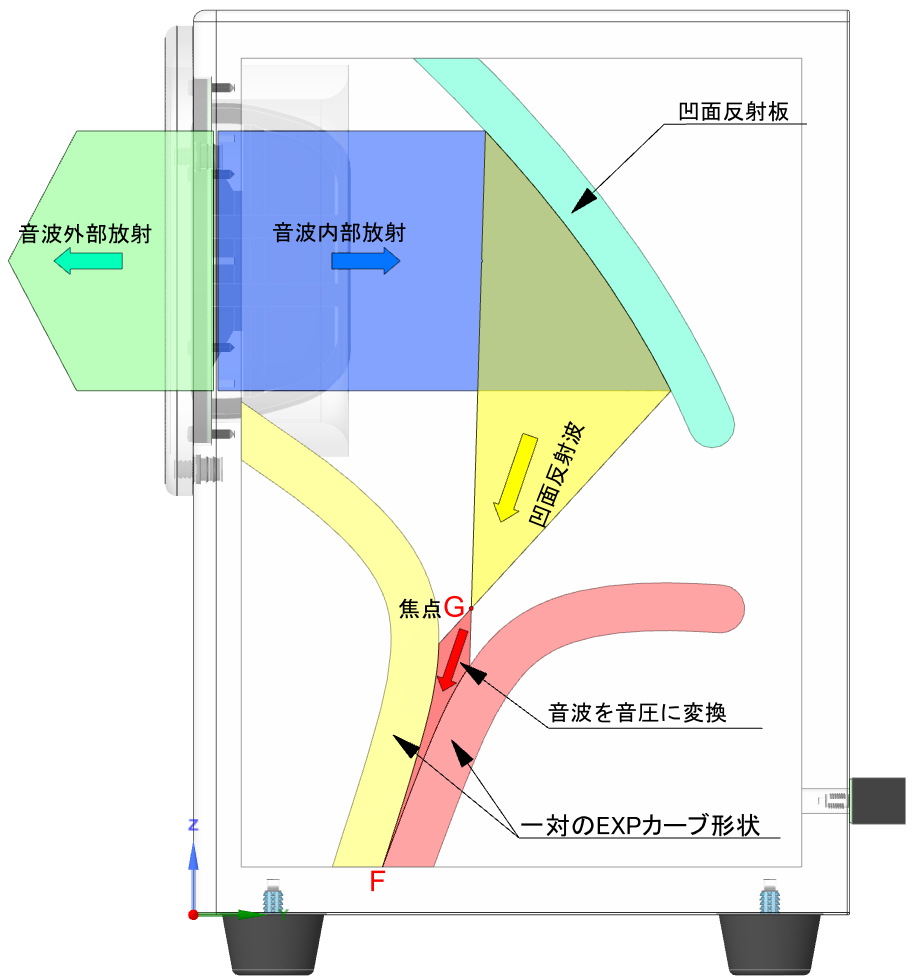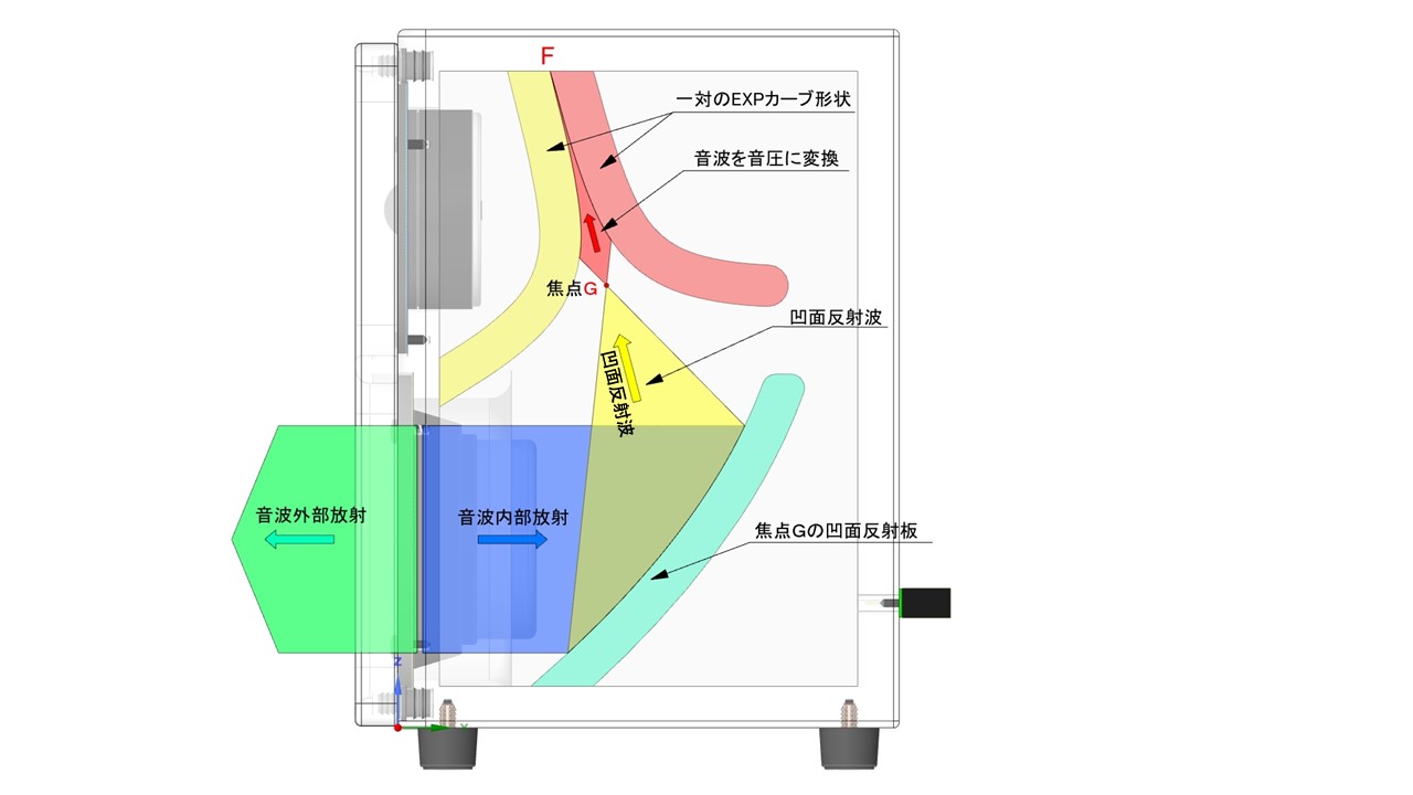 音波外部放射(➜)と同時にボックス内部に同量の音波内部放射(➜)が行われます。内部放射音波は焦点(G)の凹面板で反射し凹面反射波(➜)となり、焦点(G)に集音されます。その後一対のエクスポネンシャルカーブ形状(黄色とピンク色)の対向内壁面に沿って(F)方向に移動すると凹面反射音波は(F)に近づくにつれて音圧に変化し音波は消滅します。音波外部放射波はスピーカーボックス内部から何の干渉も受けないので、歪が少なく透明で高音質な低音が再生できるのです。
