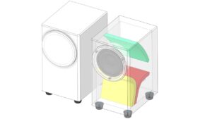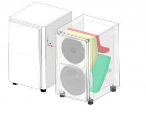 スピーカードライバーから内部に放射された音波は「凹面反射板(緑色)」で下方向に反射され、一対のエクスポネンシャルカーブ形状(黄色、朱色)の開口部中央に焦点を結びます。更に焦点からエクスポネンシャルカーブ形状を「下方向」に進むにつれて音波は音圧に変換されます。この変換によって音波は消滅します。スピーカードライバーにはスピーカーボックス内部からの音波の反射波が無くなり極めて歪が小さい高音質で高解像度、低価格(内部に3枚の板を追加するだけ)のウーファーが完成しました。